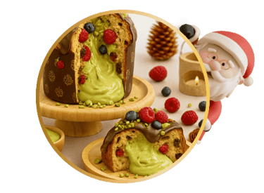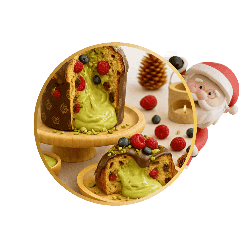 ¡Una opción sofisticada y llena de contrastes deliciosos! El Panetón de Pistacho & Frutos Rojos une la cremosidad del pistacho con la acidez vibrantes de frutos rojos seleccionados, creando una combinación equilibrada.